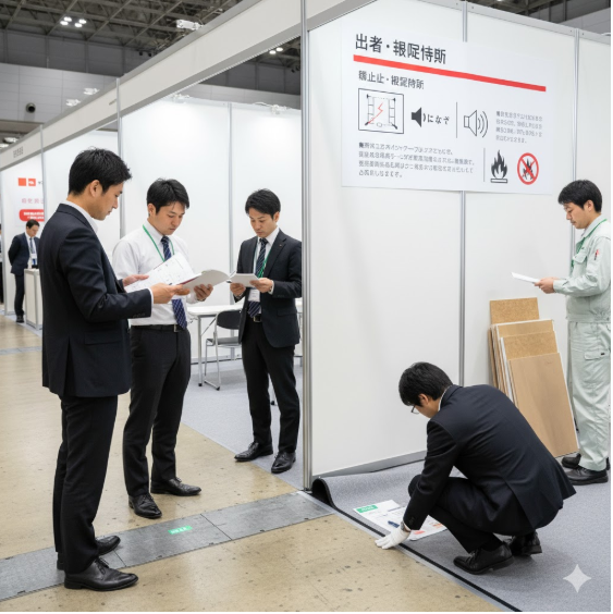 「知らなかった」では済まされないため、ブース装飾業者や運営スタッフ全員でマニュアルを共有し、ルールを遵守することが絶対条件です。
